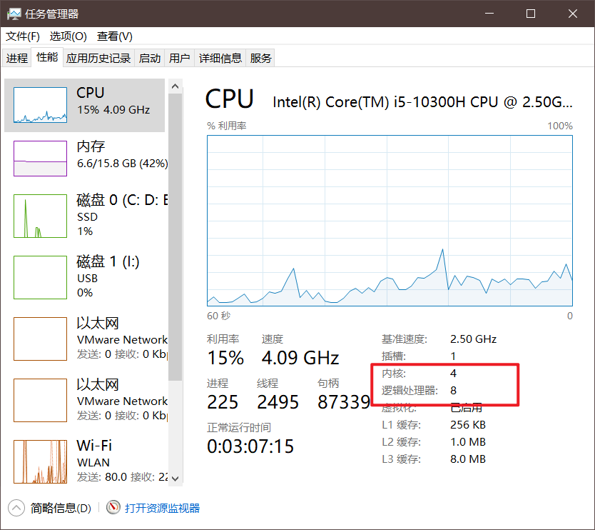这里显示有4个内核,8个逻辑处理器,4核代表了物理机时机的处理器个数,而逻辑上可以将一个核分为两个处理器,有多少个逻辑处理器就能开多少个线程;