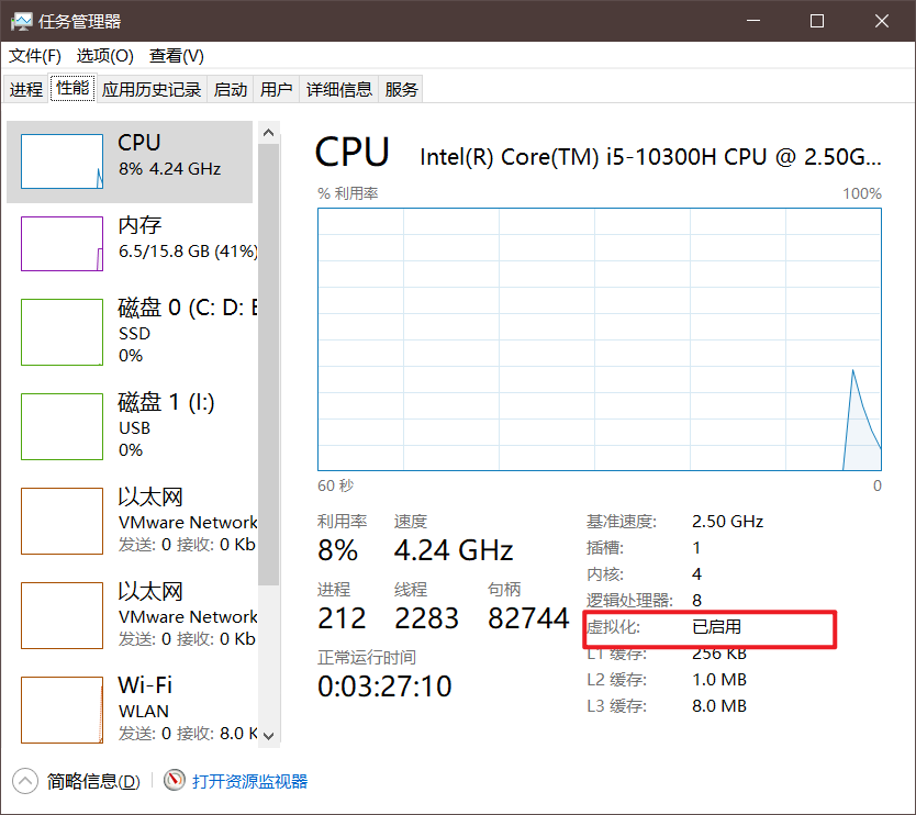 【性能】中显示【虚拟化:已启用】说明已经打开,如果没有打开的话启动虚拟机会报错: