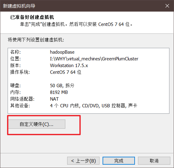 点击【完成】即可,如果有需要修改的可以上一步返回,或选择【自定义硬件】: