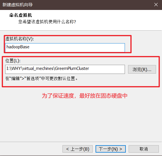 虚拟机名称可以自定义,这里我们首选创建的是【模板虚拟机】,将来会基于该虚拟机来创建集群中的机器,因此起名为【hadoopBase】;