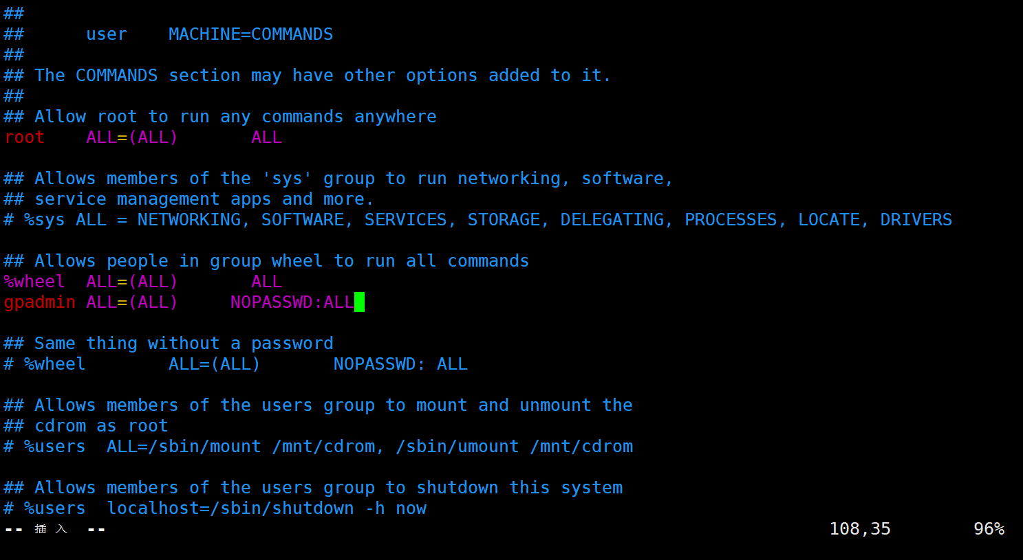 (6)给用户添加root权限:vim /etc/sudoers