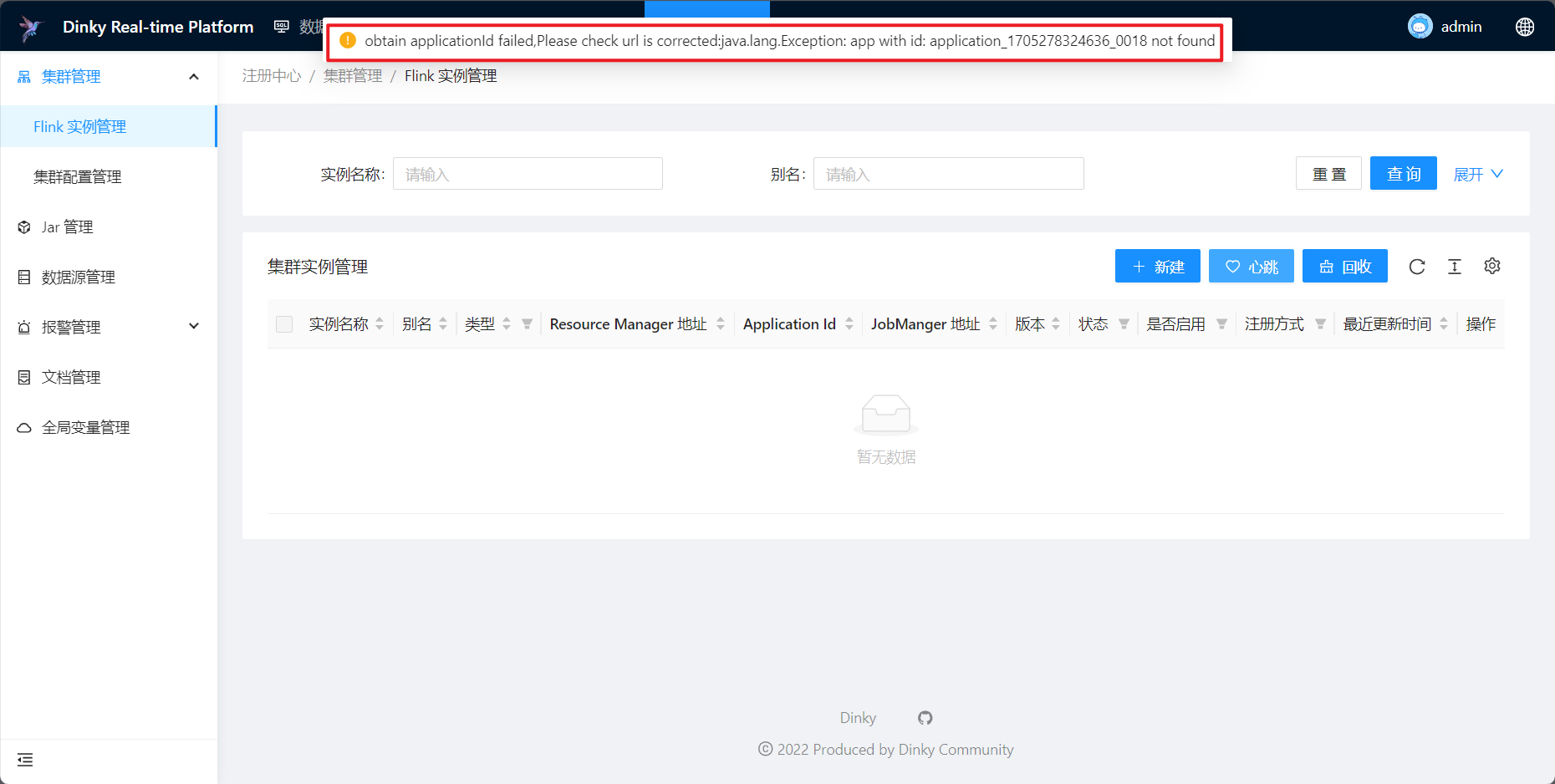 根据这条报错信息我推测之前创建的实例并没有消失,只是由于未知异常没法显示出来,要不然之前实例中配置的Job ID application_1705278324636_0018应该不会产生任何影响;