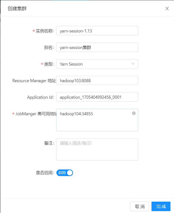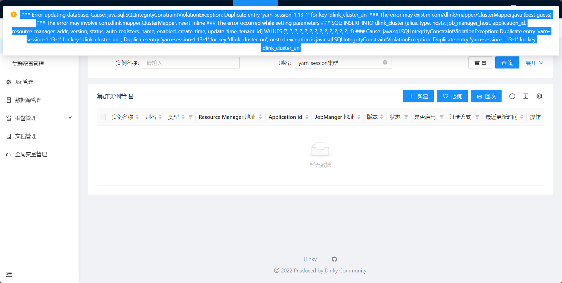 ### Error updating database. Cause: java.sql.SQLIntegrityConstraintViolationException: Duplicate entry 'yarn-session-1.13-1' for key 'dlink_cluster_un' ### The error may exist in com/dlink/mapper/ClusterMapper.java (best guess) ### The error may involve com.dlink.mapper.ClusterMapper.insert-Inline ### The error occurred while setting parameters ### SQL: INSERT INTO dlink_cluster (alias, type, hosts, job_manager_host, application_id, resource_manager_addr, version, status, auto_registers, name, enabled, create_time, update_time, tenant_id) VALUES (?, ?, ?, ?, ?, ?, ?, ?, ?, ?, ?, ?, ?, 1) ### Cause: java.sql.SQLIntegrityConstraintViolationException: Duplicate entry 'yarn-session-1.13-1' for key 'dlink_cluster_un' ; Duplicate entry 'yarn-session-1.13-1' for key 'dlink_cluster_un'; nested exception is java.sql.SQLIntegrityConstraintViolationException: Duplicate entry 'yarn-session-1.13-1' for key 'dlink_cluster_un'