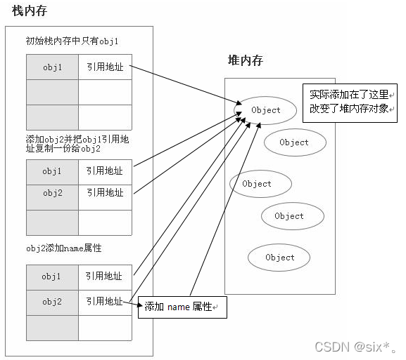 var obj2 = obj1; // obj1赋值给obj2,实际上是把obj1在栈内存的引用地址复制了一份给obj2 这样的话他们就会指向同一个堆内存对象