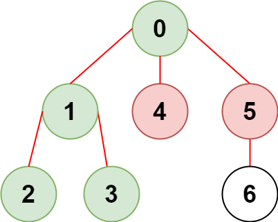 输入:n = 7, edges = [[0,1],[1,2],[3,1],[4,0],[0,5],[5,6]], restricted = [4,5] 输出:4 解释:上图所示正是这棵树。 在不访问受限节点的前提下,只有节点 [0,1,2,3] 可以从节点 0 到达。