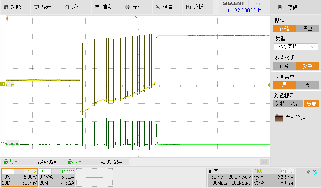 下面是特定负载上电过流关断响应。存在上电过流关断再打开,循环,反复充电过程。整个过程持续几十mS级。其上电时序可能对负载工作存在影响。