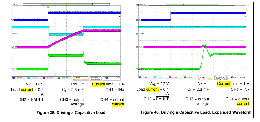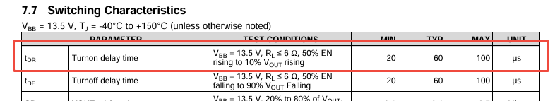 以TPS2HB50-Q1为例,其本身不具备外部缓启动调节能力,IC本身的启动非常迅速,60uS TYP,那么在偏容性负载时其很容易由于给电容充电瞬间过流导致关断。