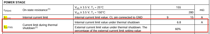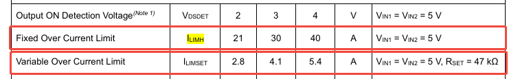 其中,Ilimh是芯片IC本身决定的,是个确定值(不可外部设定),这颗芯片是30A Typ。Ilimset是用户根据需求可以通过外部电阻Rset设定的过流值,当Rset=47K时,对应的限流值为4.1 A Typ。对应的规格书参数: