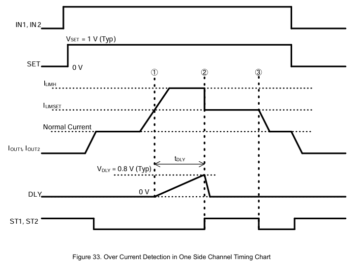 “This IC has two over current limiting functions, fixed over current limit (ILIMH) for protecting the IC and variable over current limit (ILIMSET) for protecting the load. The variable over current limit (ILIMSET) can be set by connecting an external resistor to the SET pin. It is also possible to set the variable over current mask time (tDLY) by connecting an external capacitor to the DLY pin. ”
