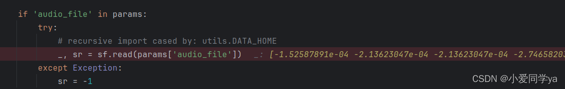 由于我使用的是asr任务,在标红色该行会进入soudfile.py文件,调用了soundfile库,这部分的逻辑主要就是文件的处理与参数传递,不多赘述。对zh.wav文件进行采样。_为采样后数据,sr为采样率。
