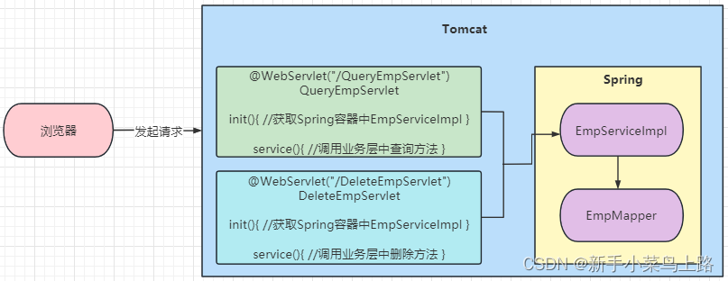 五:Day09_SpringMVC01 目前我们所写的项目,持久层、业务层的类都放入到Spring容器之中了。他们之间需要注入非常方便,只需要通过@Autowired注解即可。但是由于Servlet整个生命周期都是被Tomcat进行管理的,一个功能对应一个Servlet并且无法把Servlet放入到Spring容器中。所以每次编写Servlet时都需要编写init方法先获取到Spring容器,然后从Spring容器中取出需要使用的Bean。本质为Spring 框架的一个扩展,在Spring官方ZIP包就是一个的jar包。