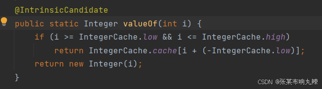 因为Integer在编译时,会调用 Integer.valueof(),我们看该方法的原码,会发现其是用一个cache数组来存储数据的,如下: