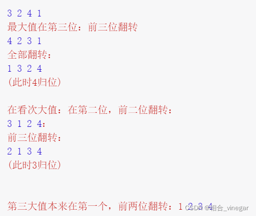 思路:类冒泡排序(冒泡排序是每一次排序都将最大的数字放在最后一位,最大的数字放在最后之后就不再参加下一趟的大小比较了)每次找到最大值,进行0~maxValueIndex翻转,再将数组全部进行翻转,就将最大值放在数组最后一位了