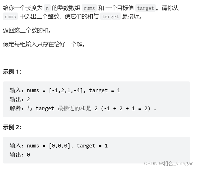 细节:先假设最接近target的数就是nums[0] + nums[1] + nums[2] 之后在进行比较:Math.abs(threeSum - target) < Math.abs(closestNum - target)