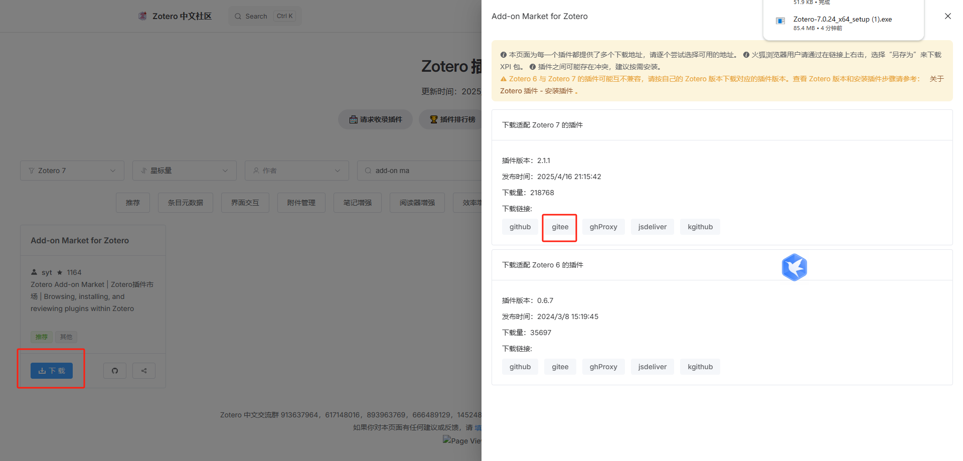 搜索Add-on Market for Zotero插件,点击下载选择gitee
