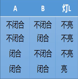 假设开关闭合=“1”,开关不闭合=“0”,灯亮,L=1灯不亮,L=0。