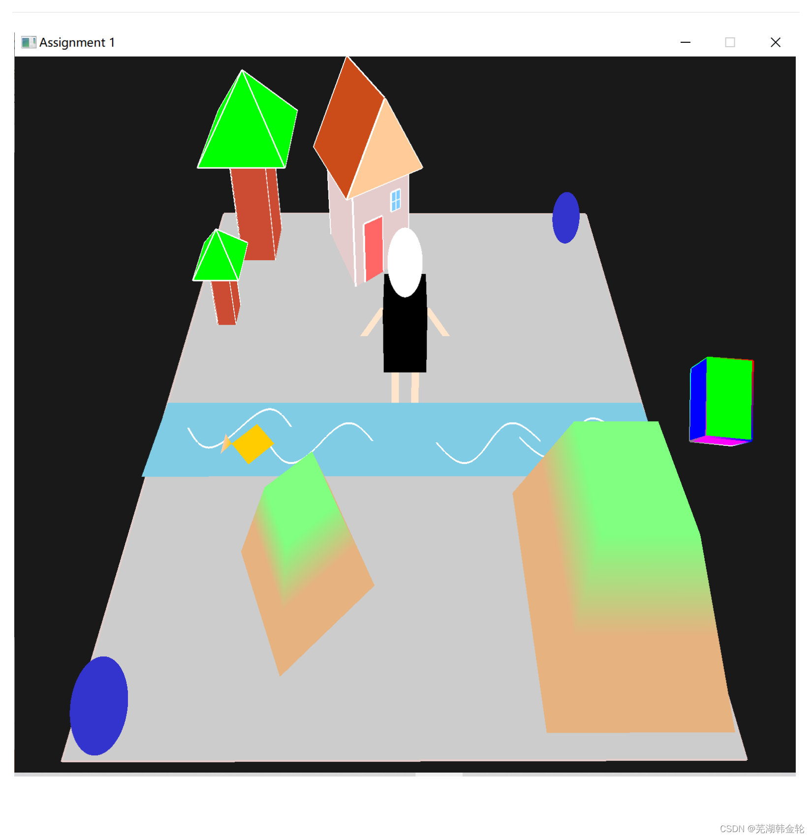 HNU计算机图形学-作业一 完整工程文件具体运行环境配置看这个栏目的第一篇文章专选课计算机图形学的第一次作业,老师是第一次给本科生上课,用的作业是香港中文大学的计算机图形学的作业内容(老师就是这个学校毕业)。第一次接触OpenGL,一开始也没学什么高级的技术,所以就简单画了一些图形的组合,只学了一周不到,写这篇文章主要为了记录和分享所学内容(毕竟也花费了很多时间的专选),代码格式也比较混乱,很多重复的部分,比如定义顶点的信息等等,凑合看看吧。下面是作业文档的要求第一个编程任务将向您介绍OpenGL图形编程接口和可编程管道。