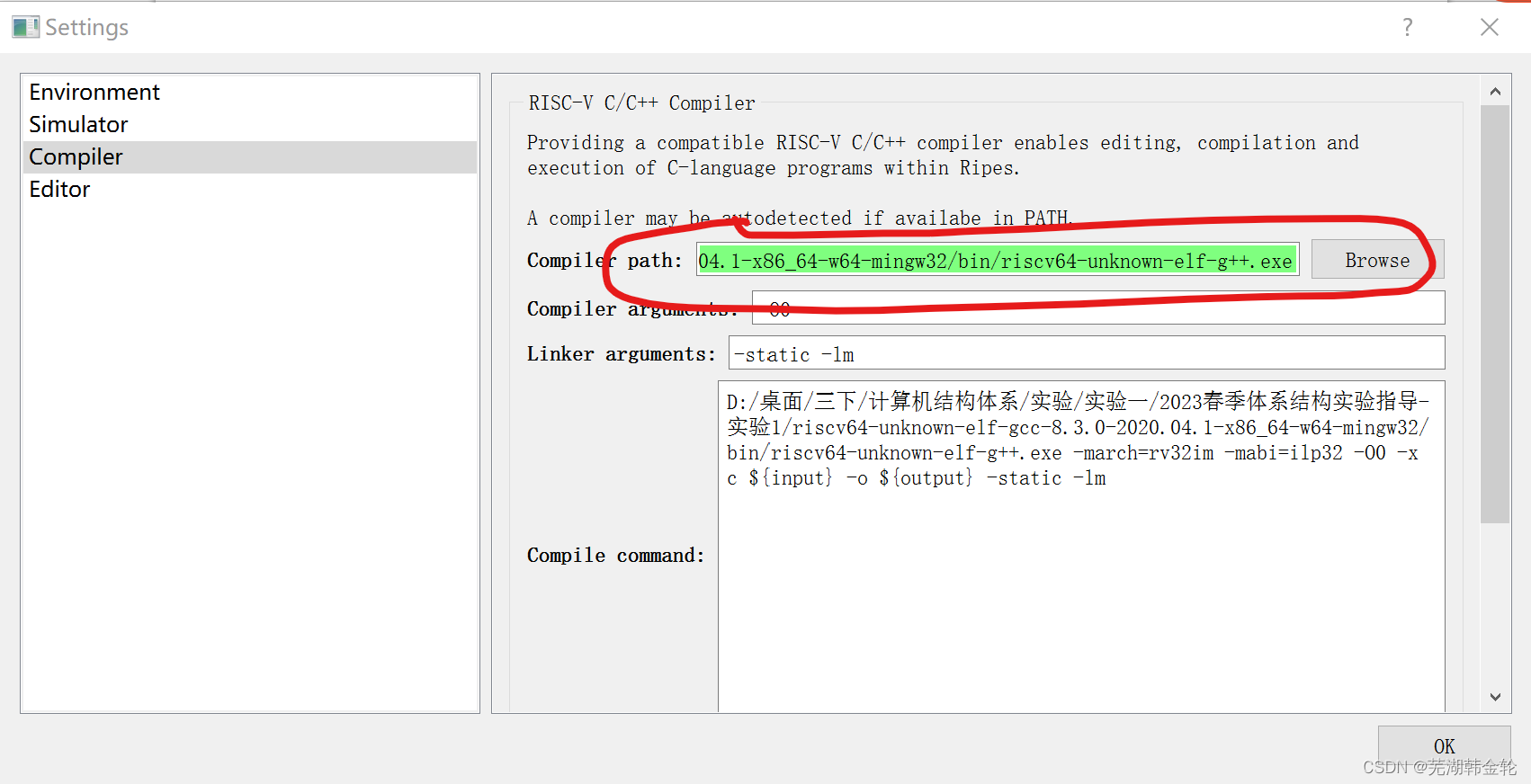 HNU计算机体系结构-实验一:RISC-V指令理解 体系结构的第一个实验,实际上是中科大的实验,GitHub直接搜ustc_ca可以搜出很多,我也是借鉴了几位大佬的。这个课是计科第一年开课的,所以以后的实验内容可能会有所调整。这次实验的内容也很简单,用ripes跑一遍即可,这个软件还是很智能的,每一步骤干什么,用的哪个寄存器,以及数值是多少都能显示出来。闲麻烦不想在GitHub上下载的,直接放到网盘了。具体用法是先打开ripes.exe,左上角editor->setiing,然后选择另一个文件夹里的编译器,然后就可以运行代码了。