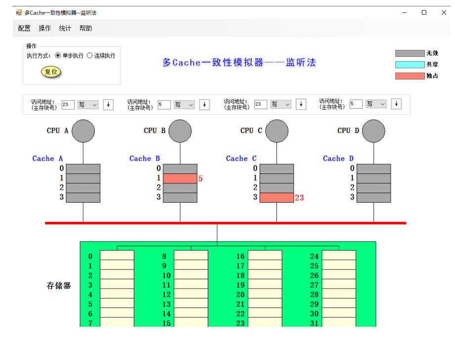 HNU计算机体系结构-实验3:多cache一致性算法 在我进行对cache一致性模拟器的实验过程中,我深入研究了监听法和目录法这两种常见的cache一致性协议。通过实际的模拟器操作,我对这两种协议的原理和工作机制有了更深入的理解。首先,我发现监听法是一种基于总线的cache一致性协议。在这个协议中,所有的缓存控制器都通过总线来监听其他缓存控制器的操作。当一个缓存控制器修改了共享数据时,它会通过总线发送一个信号,让其他缓存控制器将对应的缓存行置为无效。这样,其他缓存控制器在需要访问这个缓存行时,就会重新从内存中读取最新的数据,保证了数据的一致性。