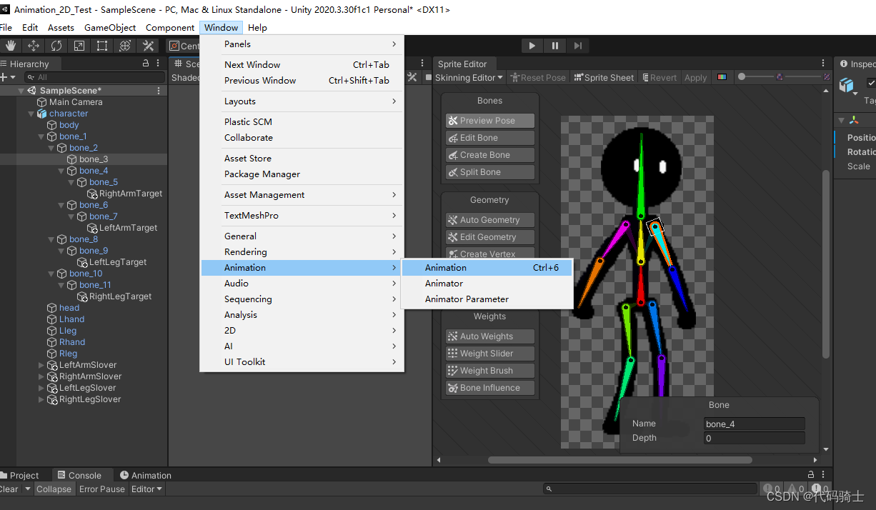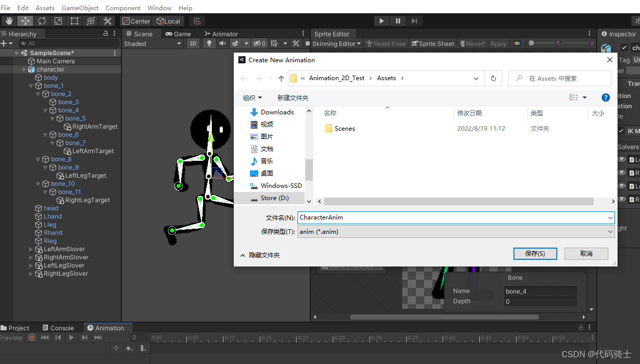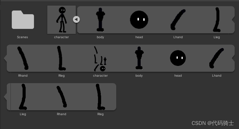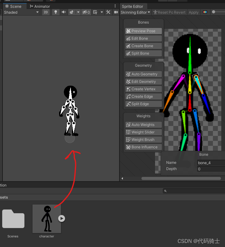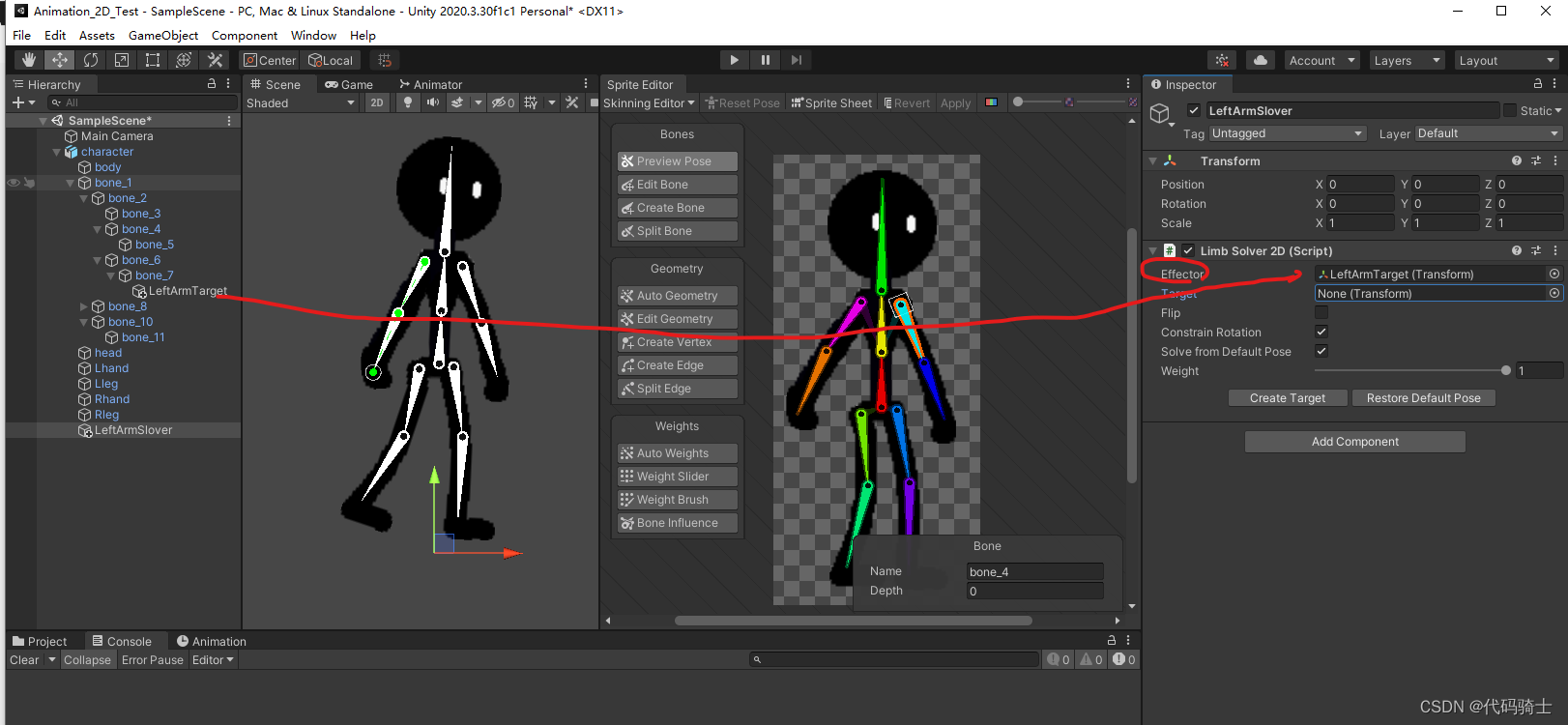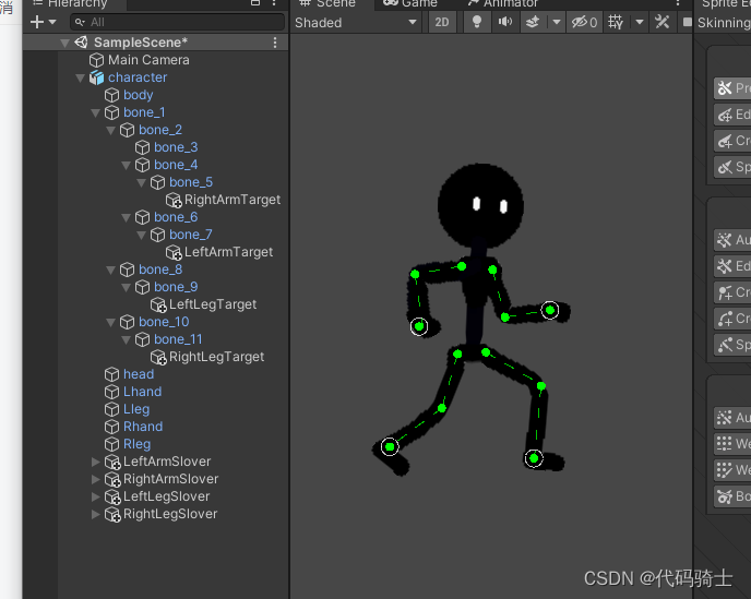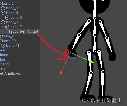 目前为止每个骨骼都是单独活动的,为了使做动画更加方便,下面我们将进行整条胳膊和整条腿的连接。Unity2D—骨骼绑定、IK系统、动画(二)_憋屈y的博客-CSDN博客_ik系统