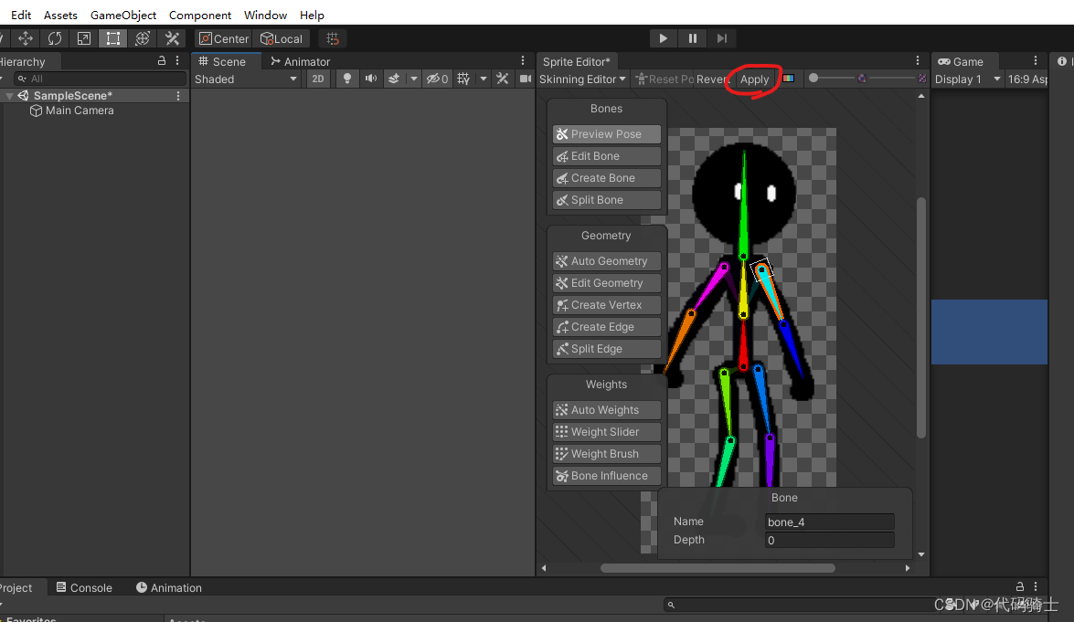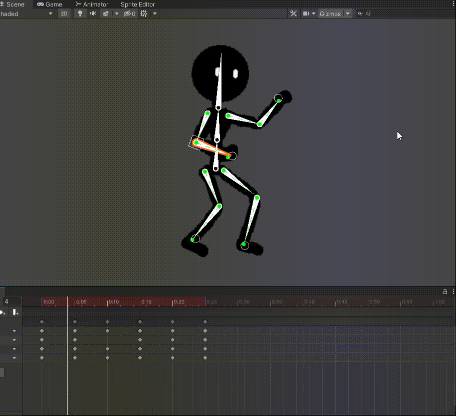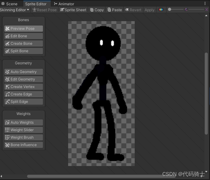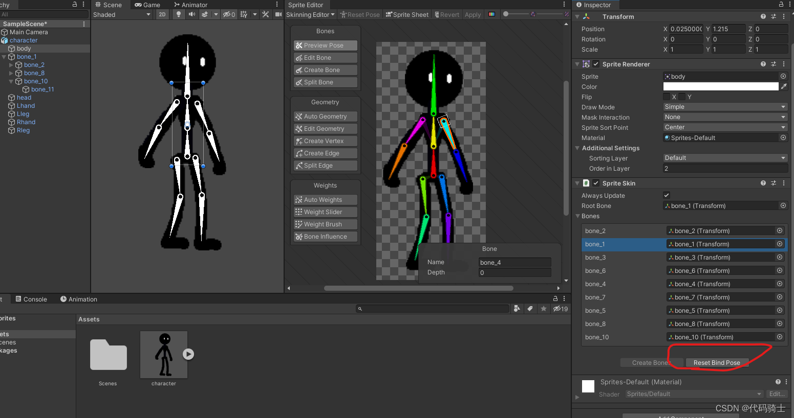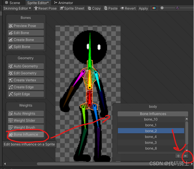 目前为止每个骨骼都是单独活动的,为了使做动画更加方便,下面我们将进行整条胳膊和整条腿的连接。Unity2D—骨骼绑定、IK系统、动画(二)_憋屈y的博客-CSDN博客_ik系统