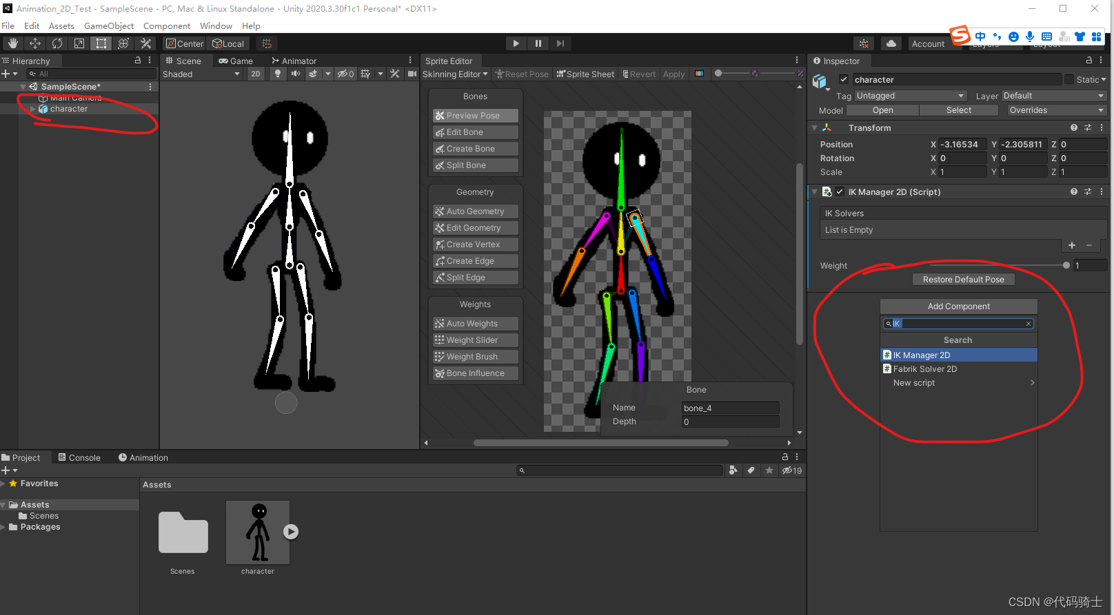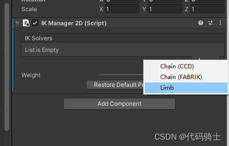 首先点击角色,并添加IK MANAGER 2D组件