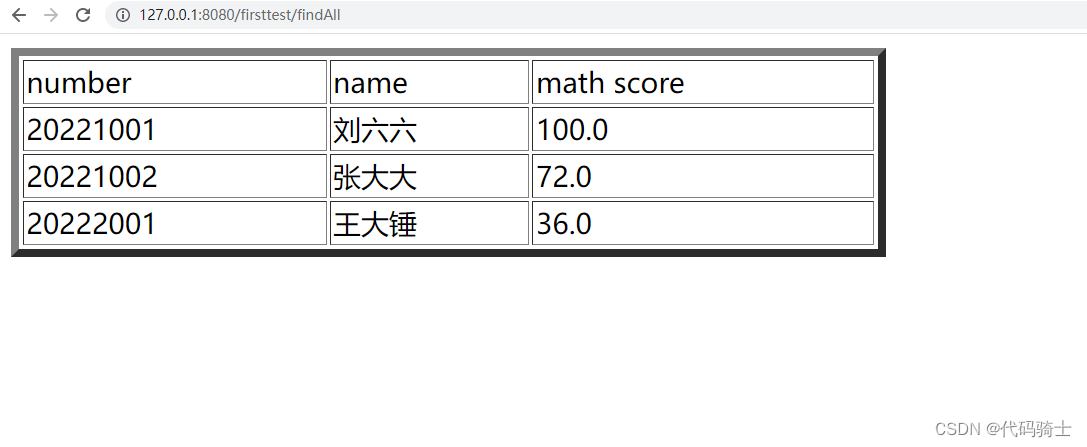 输入网址http://127.0.0.1:8080/firsttest/findAll查看结果: