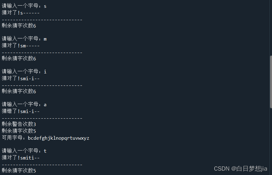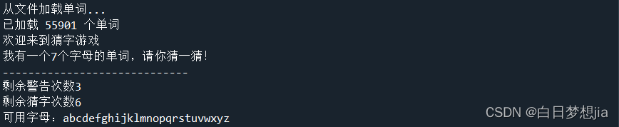 实验八:编写一个简化的交互式猜单词游戏程序。游戏开始时,程序随 机挑选一个单词让用户猜,并给用户规定剩余猜测次数、警告次数。(警告次数6次,猜测次数3次,将猜出的和未猜中的都要打印出来,重复猜错的要有提示)