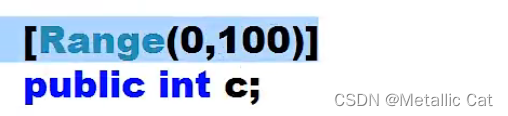 如果我们想在编译器中(脚本框中)给字段设置一个取值范围的话,只需要在对应字段的上面加一行代码 --- [Range(a,b)] --- a和b分别是范围的上界和下界