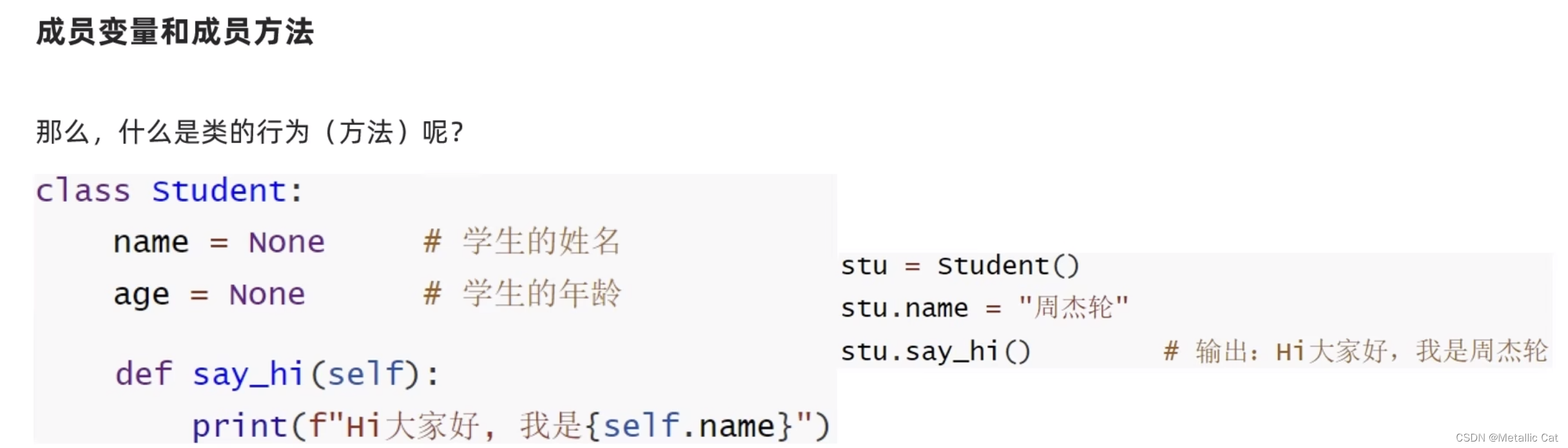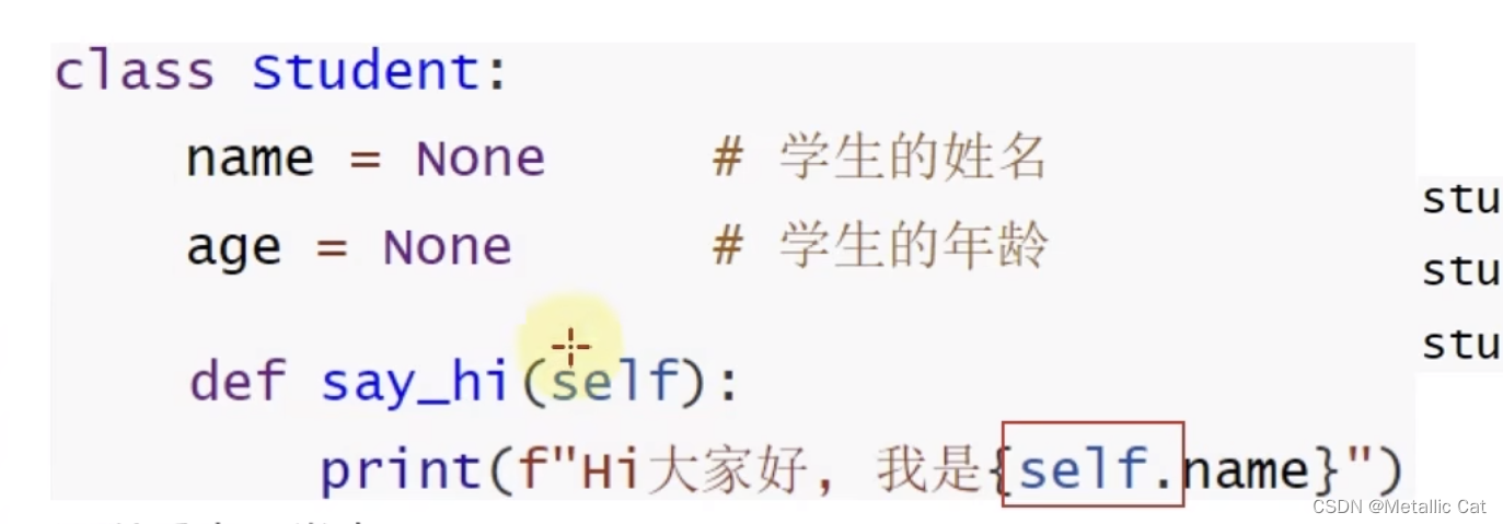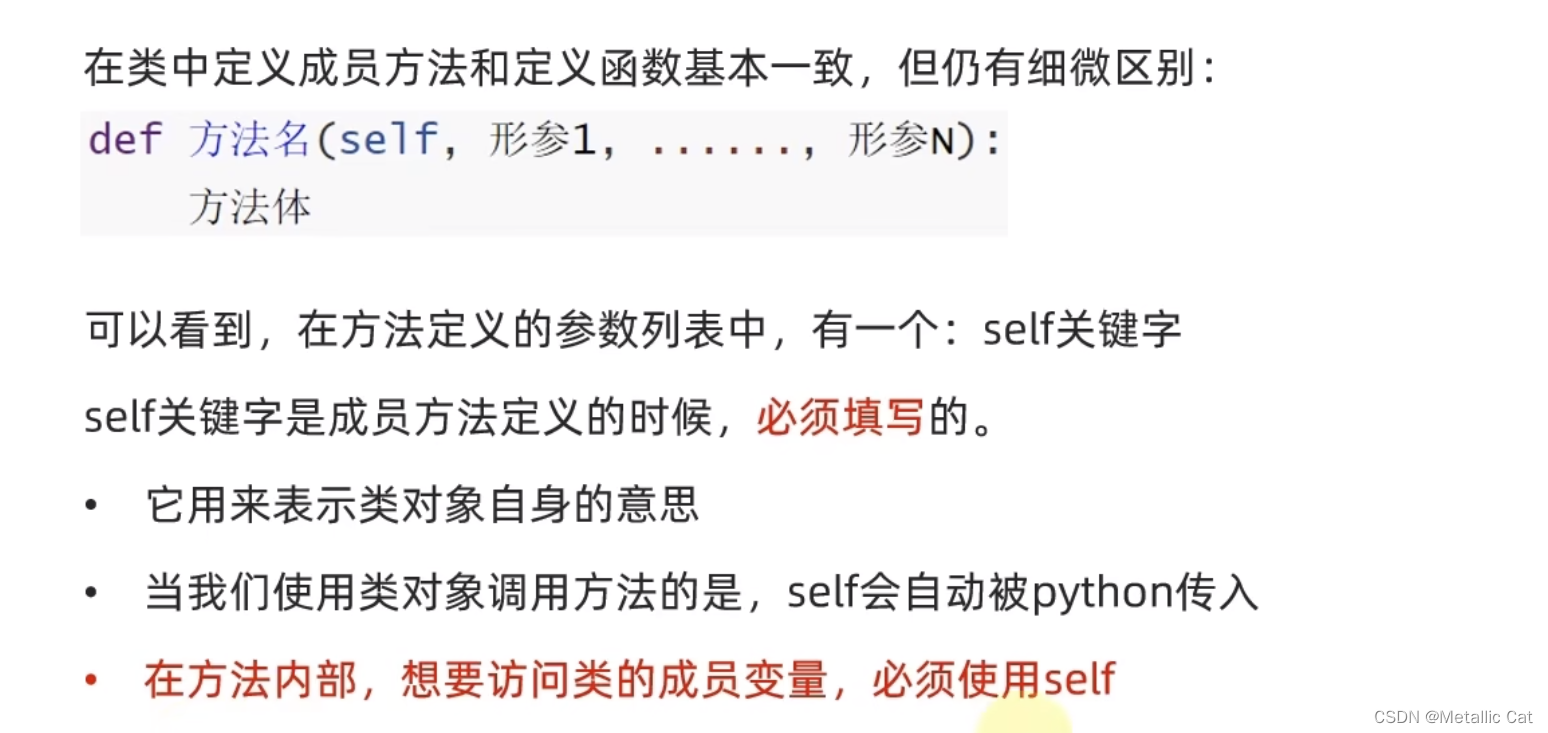 1.上面这一段代码中就展示了如何在方法中访问类的成员变量: self.成员变量名