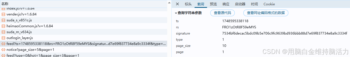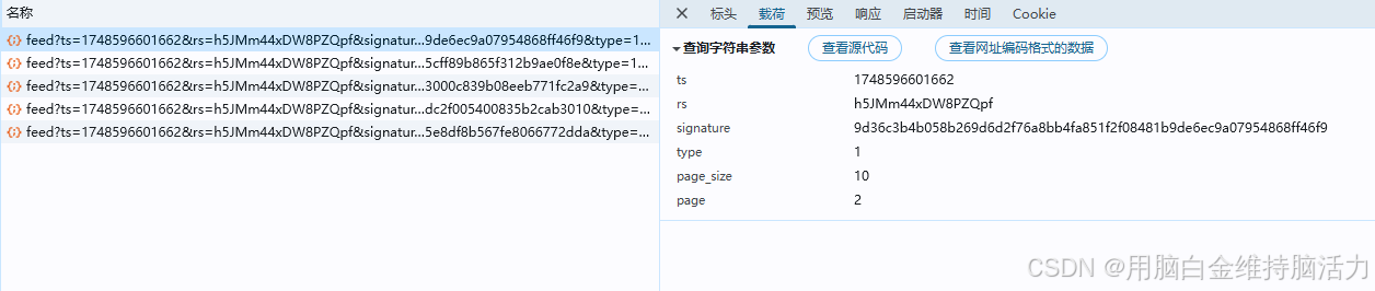可以看到有6个参数,那么懂行的都知道(引用付航的脱口秀哈哈),第一个参数ts,十有八九就是时间戳了,也就是timestamp缩写,当然也不全是,目前我还没遇到过。最后三个参数也很简单,字面意思。那就剩两个参数了,rs,signature。经过测试呢,两个都加密,这里我就不具体说怎么测试了,控制变量法哈哈哈。