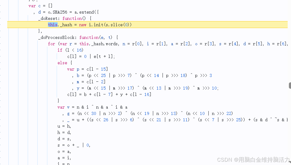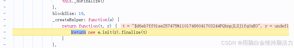 首先我们进到c函数,发现 new e.init(r).finalize(t) 这是在开始初始化然后调用方法了,也就是说,是这里的方法开始对t进行加密的,所以我们做的就是单步跳,看看具体是做的什么加密。