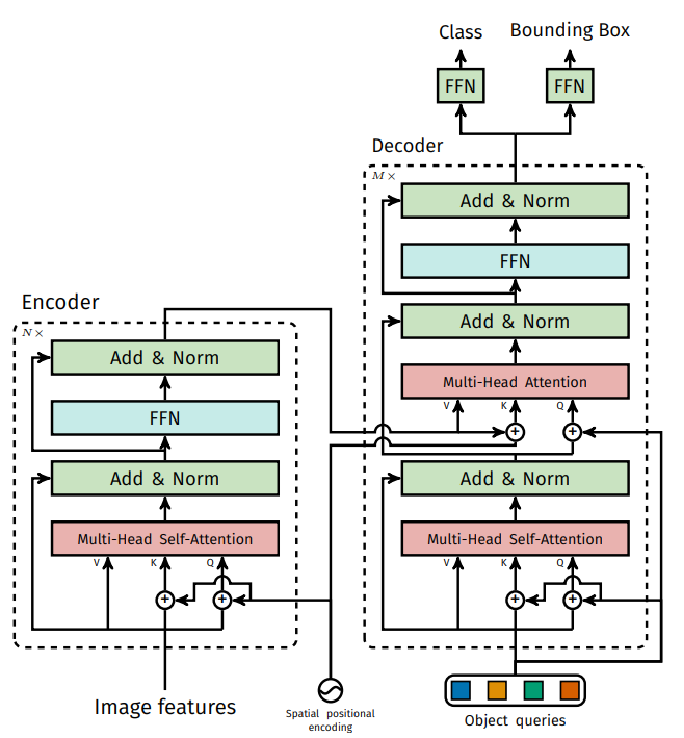解码器首先随机初始化object queries(0+位置编码),以自身为q,k,v,做自注意力机制运算,以计算结果作为下一次注意力机制的query(加上位置编码),同时,注意力机制以encoder的输出为keys和value,最终经过6次的decoder模块,将6次decoder的结果保存,shape改变为6*batch_size*100*256