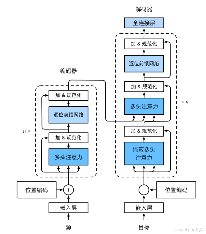 【深度学习】Transformer Transformer作为编码器-解码器架构的一个实例。正如所见到的,Transformer是由编码器和解码器组成的。与基于Bahdanau注意力实现的序列到序列的模型相比,Transformer的编码器和解码器是基于自注意力的模块叠加而成的,源(输入)序列和目标(输出)序列的嵌入(embedding)表示将加上位置编码(positional encoding),再分别输入到编码器和解码器中。链接无法跳转,想看请移步。