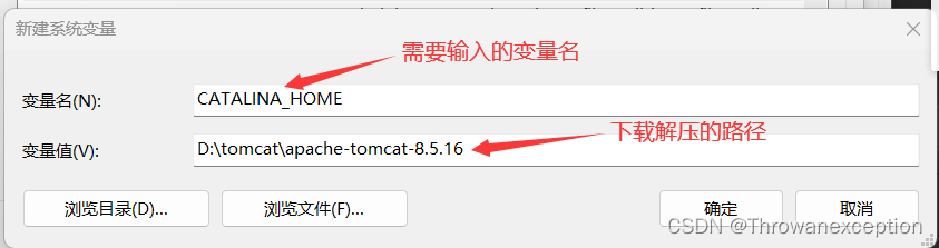 变量值一行输入:下载解压时的路径,如D:\tomcat\apache-tomcat-8.5.16