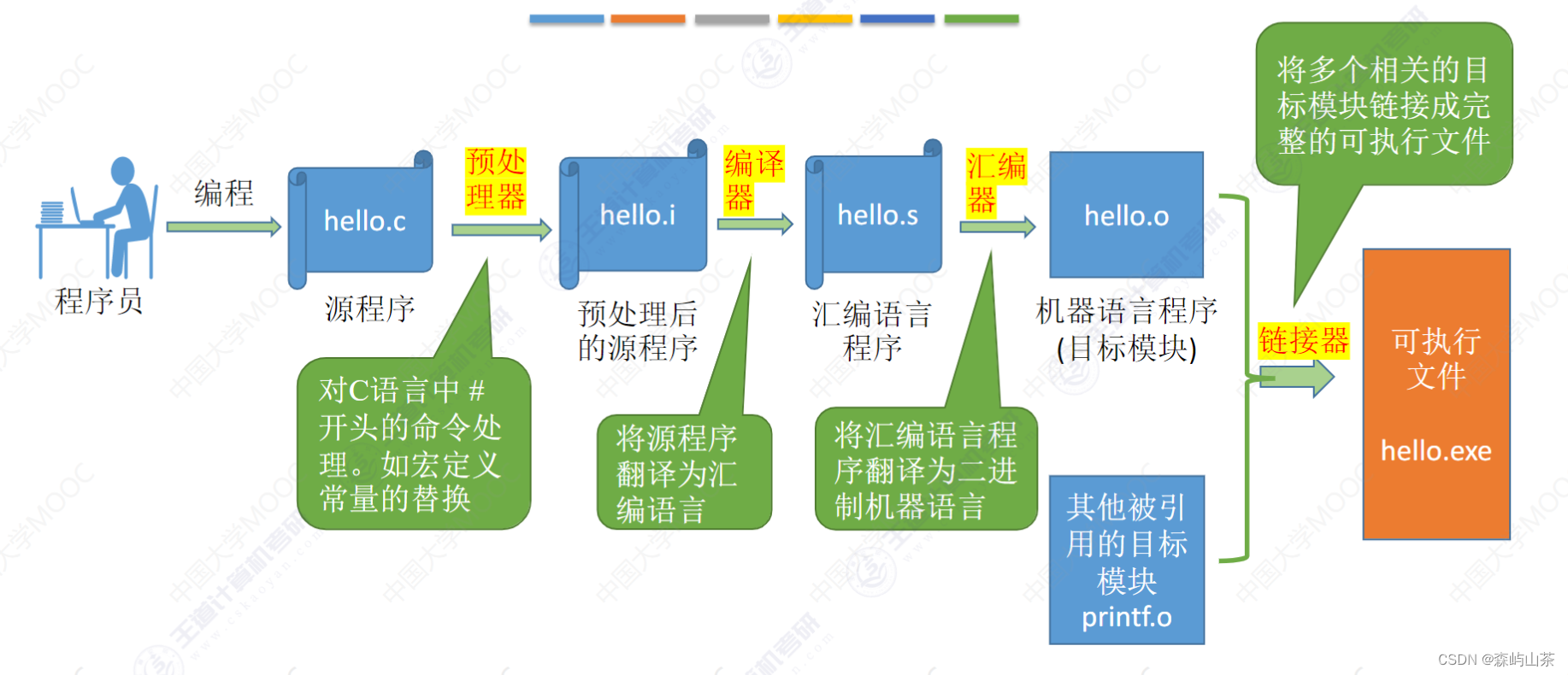 高级语言源程序转换为机器级目标代码文件的过程:预处理->编译->汇编->连接