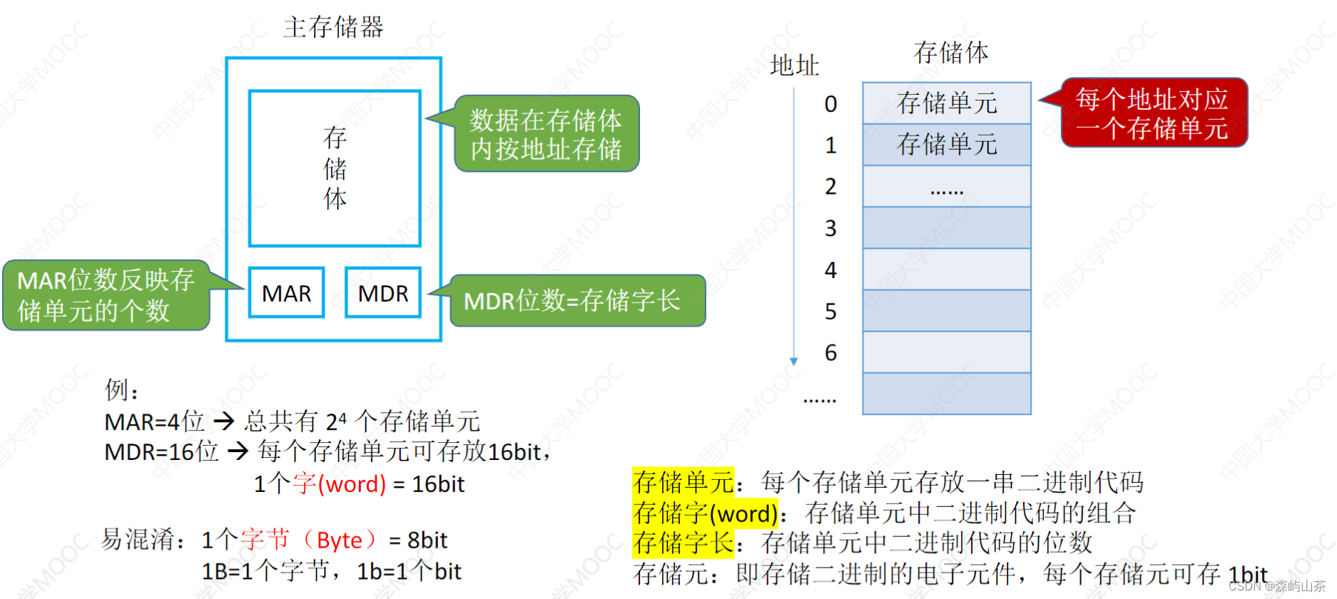 2.主存容量:主存储器所能存储信息的最大容量,通常以字节衡量,也可用字数*字长表示,其中MAR位数反映了存储单元个数,MDR位数反映了存储单元的字长。