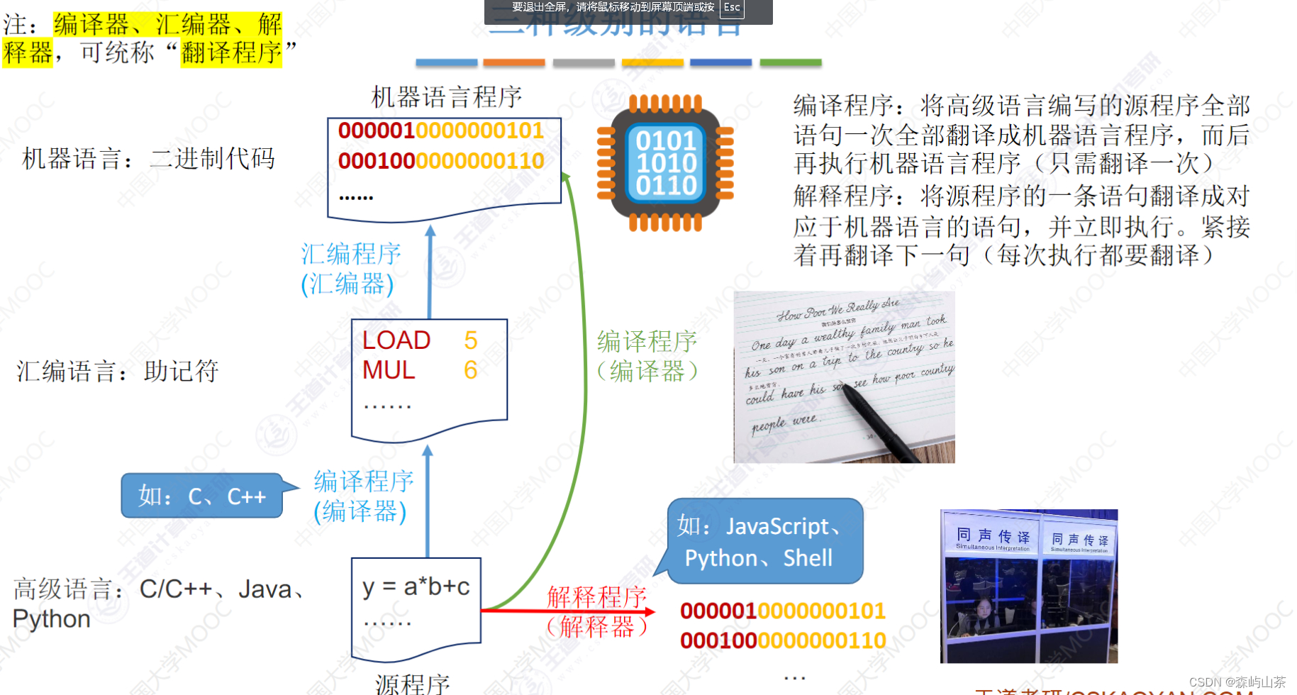 对于软件和硬件的逻辑功能等价性:同一个功能既可以用硬件实现(性能高成本高),也可以用软件实现(性能低成本低)。指令集体系结构(ISA):软件和硬件之间的界面,定义一台计算机可以支持哪些指令、每条指令