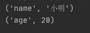 (4)items() 查找字典中所有的键值对,返回可迭代对象,里面的数据是元组,key在前值在后