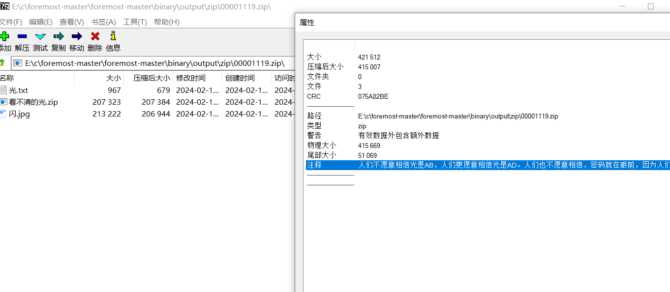 在图片文件尾发现了压缩包的文件头,用foremost分离一下。