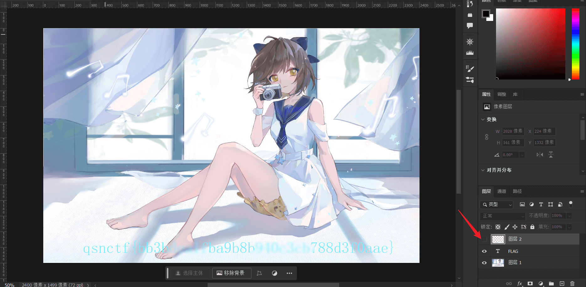 解压获得psd文件,打开后隐藏图层2即可获得flag。