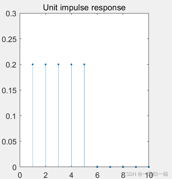 由前面的表达式可以看出,该滤波器的单位冲击响应是单位阶跃函数的一段,可以用下面的代码块表示