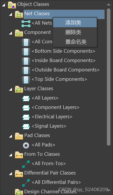 2、将鼠标放到Net Class 上,点击右键,选中Add Class,如下图所示。