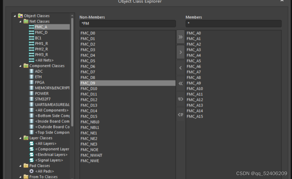 4、在Non-Members下方有一个过滤栏,过滤栏下方是工程中包含的所有网络名称,选中需要绕等长的线(可以通过过滤栏帮助快速选中目标网络)并点击**>将这些网络添加到右边的框中,如下图。