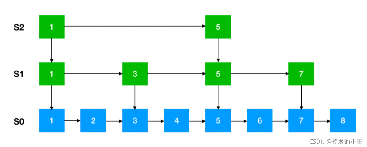 这是跳跃表的简单原理图,每一层都有一条有序的链表,最底层的链表包含了所有的元素。这样跳跃表就可以支持在 O(logN) 的时间复杂度里查找到对应的节点。