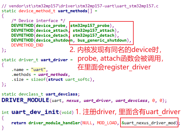 当内核发现有同名的device_t和driver_t时,就会调用driver_t里面提供的device_probe、device_attach函数。