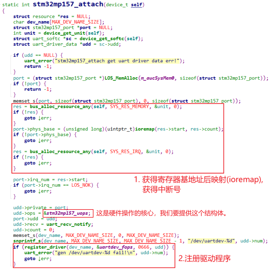 在device_attach函数里从device_t里获取硬件资源、注册驱动: