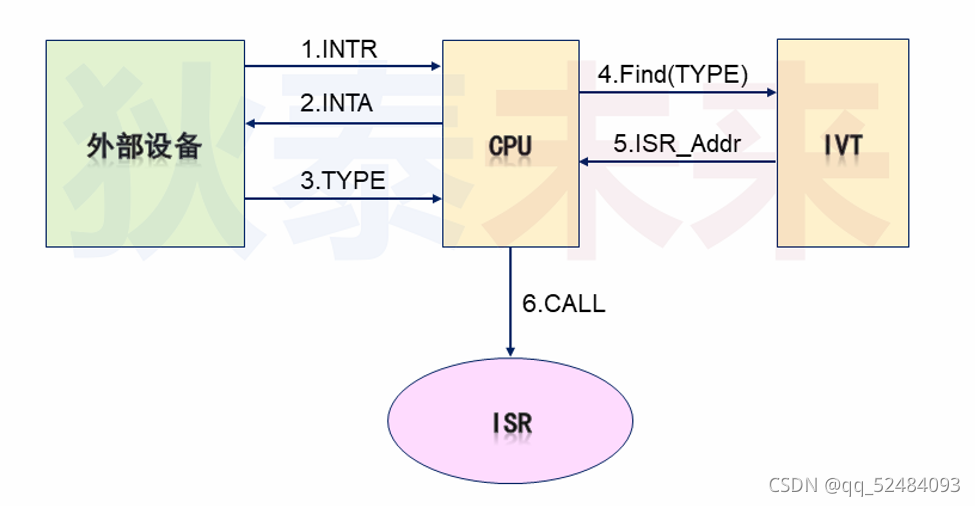 处理器接收到中断信号时,能够询问到中断向量 (中断类型号);通过中断向量查找IVT,获取ISR入口地址;之后,跳转执行 (类似函数调用)。