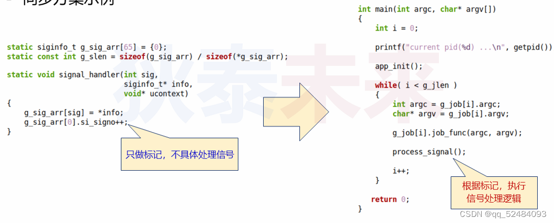 - 同步处理方案,通过设计让任务代码和信号处理代码交替执行