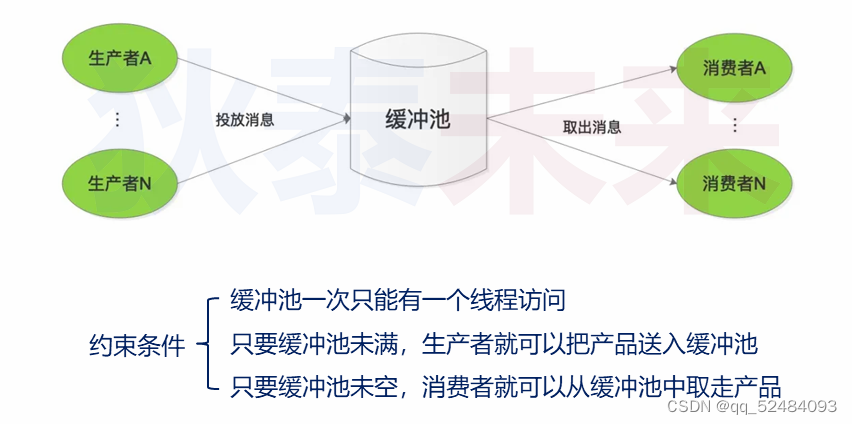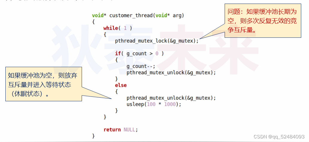 消费者发现缓冲池为空的时候,主动让出互斥量,并进入等待状态